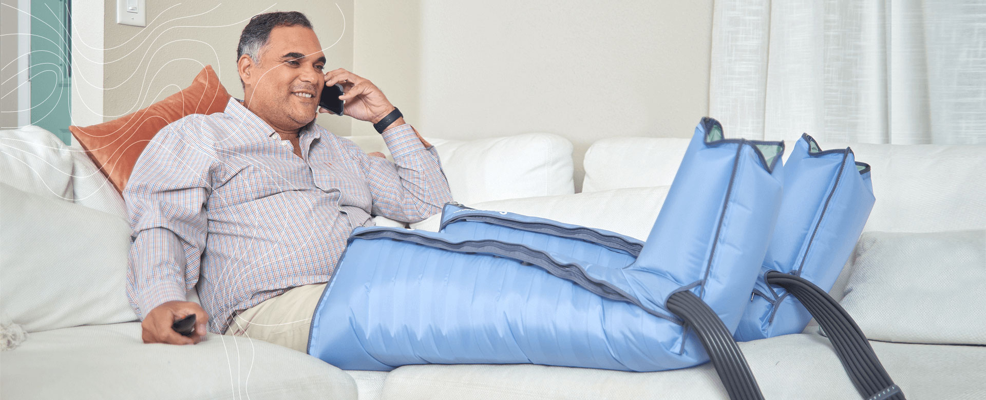 Remove your compression garments and use your Lympha Press® over nonbinding, comfortable clothing. You can use the Lympha Press® in the morning before putting on stockings, or in the evening after removing them. Lympha Press® should not be used over bare skin; wear soft, comfortable clothing such as socks and sweat pants for legs or a long sleeved t-shirt for arms, as a liner.